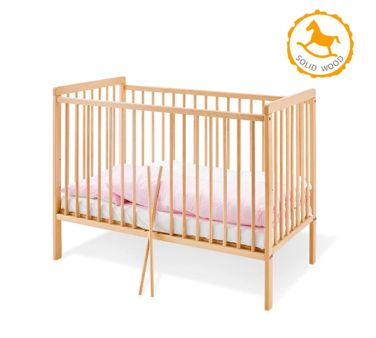 La cuna de madera ecológica 'Hanna' es el mobiliario perfecto para la habitación del bebé, tiene un tamaño de colchón de 120 x 60 cm y ofrece libertad para su hijo con 2 barrotes deslizables. Es una cuna robusta de madera maciza con barras redondas en los cuatro extremos de la cuna. Se puede regular en 3 alturas, por lo que el tiempo de vida útil es mucho mayor. Hecha de madera maciza de Haya sin tratar.