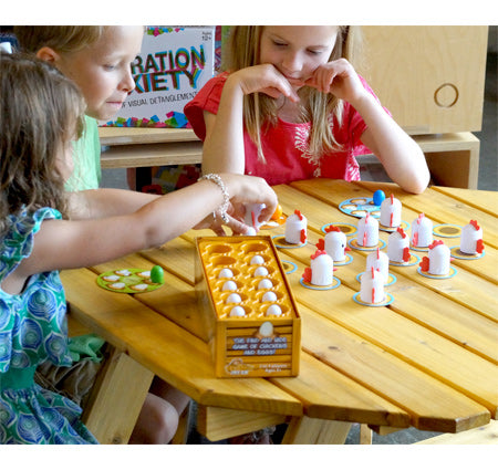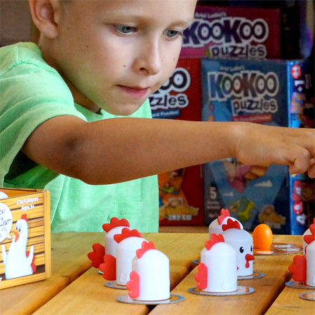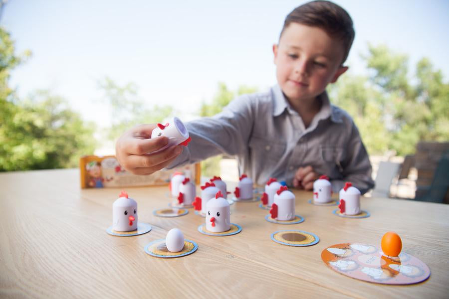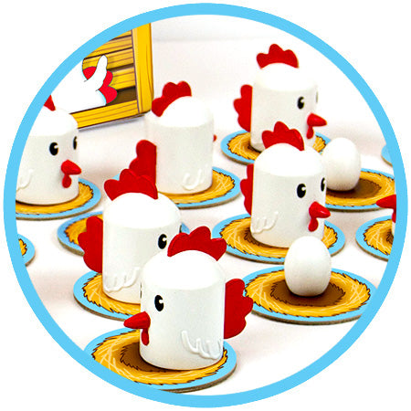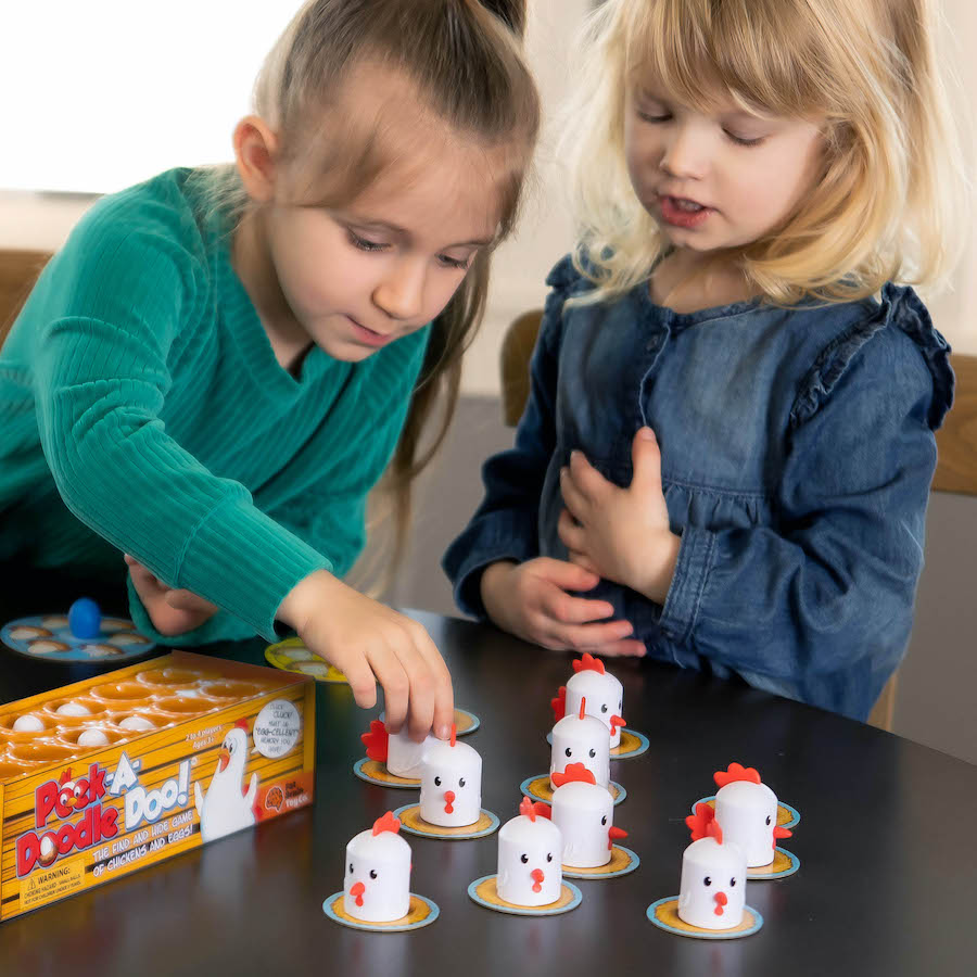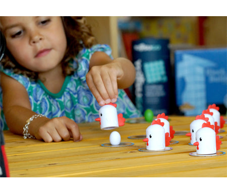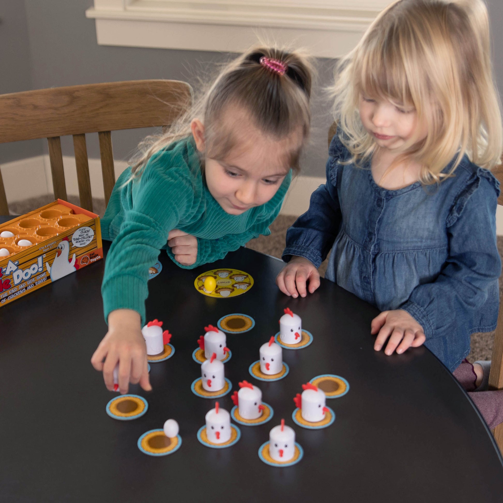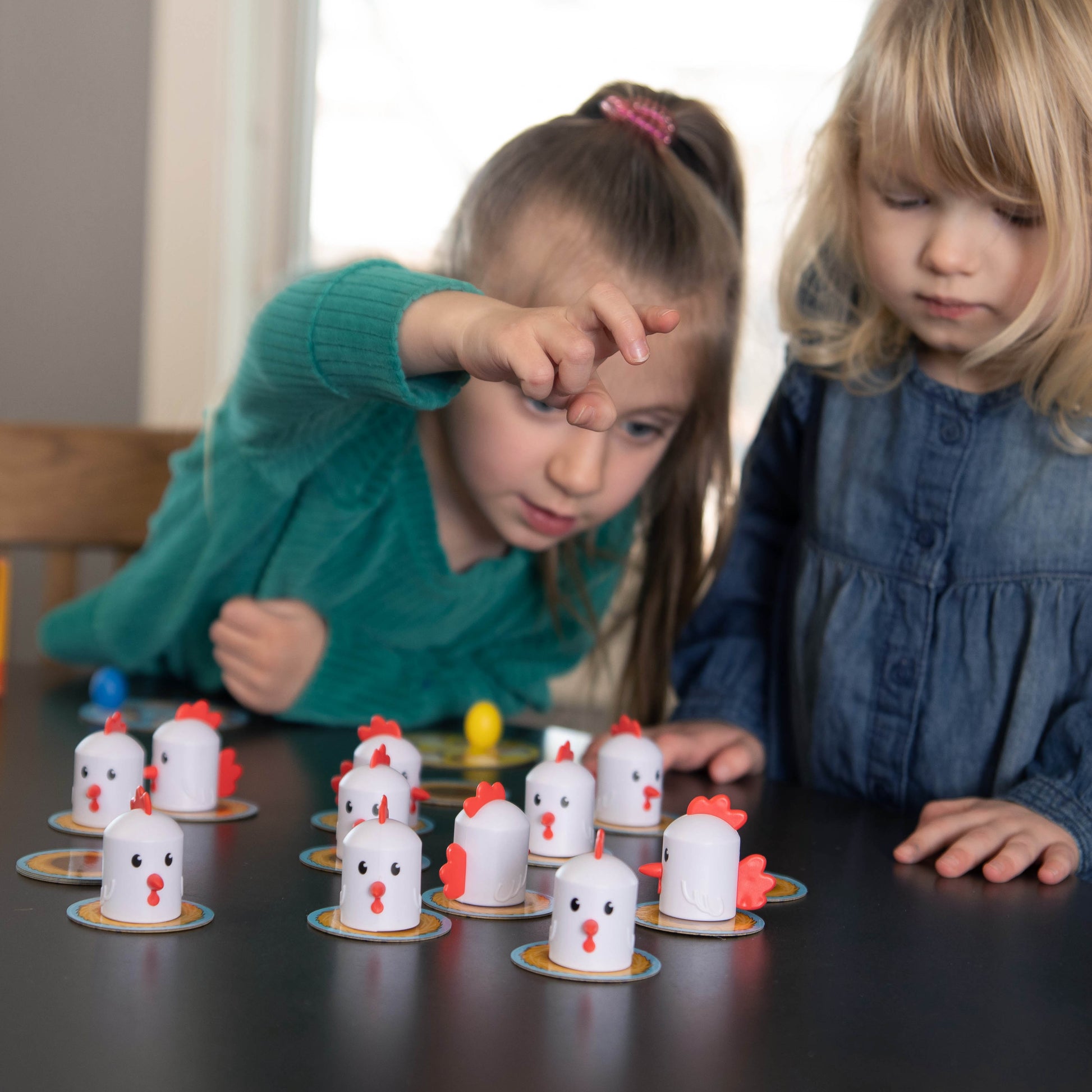 El juego de encontrar y esconder gallinas y huevos! Peek-a-Doodle Doo es un juego divertido diseñado para mejorar la concentración y las habilidades de memoria. A diferencia de otros juegos basados en la memoria, las piezas de este juego están en constante movimiento, lo que añade un desafío adicional. Nunca dos juegos serán iguales. Diversión garantizada. En primer lugar, utiliza la memoria para recoger los 12 huevos y devolverlos a la caja. Luego, usa la memoria para cubrir los 12 huevos de las gallinas. Incluye 15 nidos, 12 gallinas, 12 huevos blancos, 4 huevos marcadores de colores y 4 nidos de puntuación. Componentes fabricados de silicona libre de BPA no tóxica de grado alimentario, plástico altamente resistente y cartón impreso reforzado.