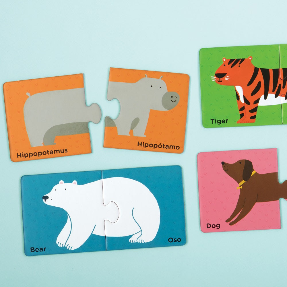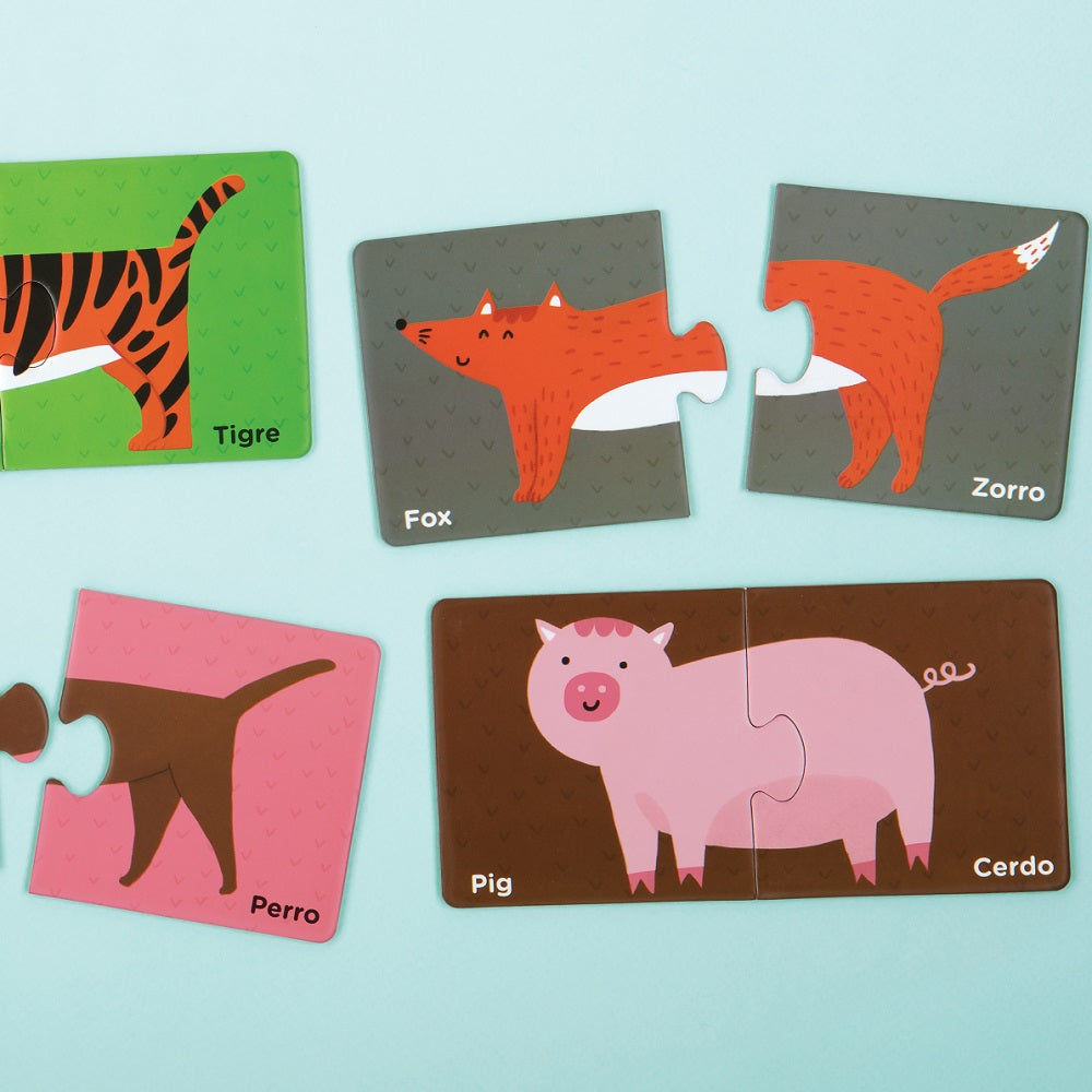 Cada uno de los 10 pares de rompecabezas tiene el nombre de un animal escrito en inglés en una mitad y en español en la otra mitad. ¡Usa las ilustraciones de animales y tus conocimientos para encontrar el par de rompecabezas! Trae10 robustos rompecabezas de 2 piezas, 20 piezas en total. Enseña a resolver problemas, conceptos educativos básicos y mejora las habilidades motoras finas. Tamaño de cada rompecabezas:15 x 8cm. Tamaño Caja: 19 x 14 x 7 cm. Las piezas del Puzzle contienen 90% de papel reciclado. Impreso con tintas no toxicas.