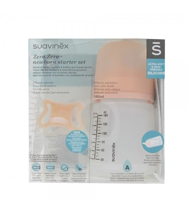 Nuevo Starter Set ZERØ.ZERØ™ con biberón anticólicos 180ml flujo adaptable y el NUEVO chupete ZERØ.ZERØ™ talla MINI -2-2 meses. El set perfecto para llevar en la maleta del hospital y cubrir las necesidades del recién nacido, contribuyendo al desarrollo bucodental.