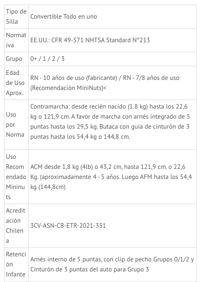 Se puede utilizar en bebés RN desde 1,8 kg (4 lbs), hasta 54,4 kg (120 lbs) y permite una contramarcha extendida hasta los 22,6Kg o 121,9 cm. El uso a contramarcha entrega un rango adicional de uso que la mayoría de las sillas convertibles a contra marcha que usualmente llegan hasta los 18Kg. La silla Eternis S All-In-One ofrece 3 etapas de uso: