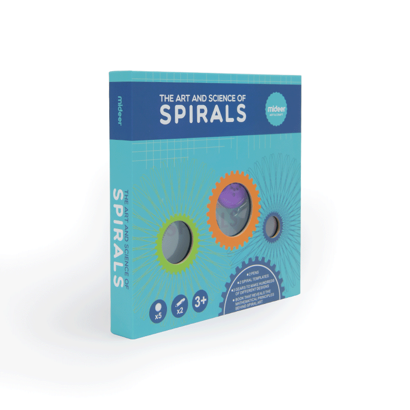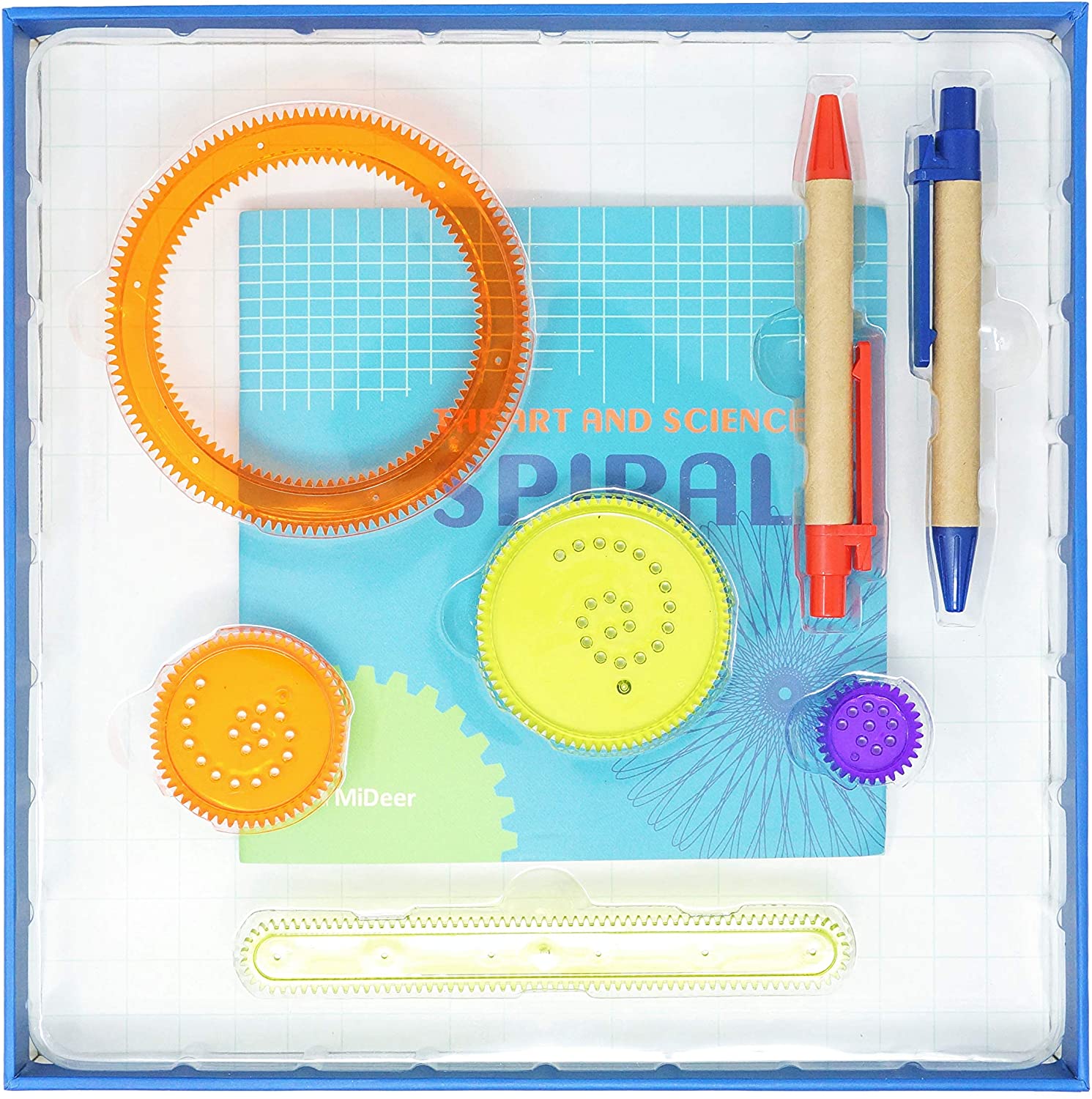 El arte de los espirales, incluye 2 lapices, 1 aro, 1 regla, 3 engranajes redondos y un libro con diseños. Imaginación infinita, para usar y dibujar diferentes diseños y patrones.