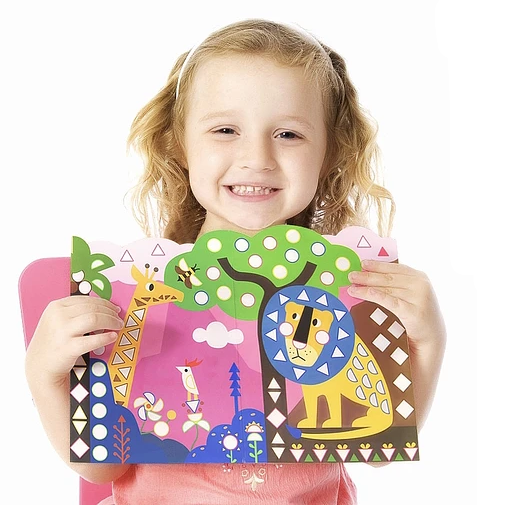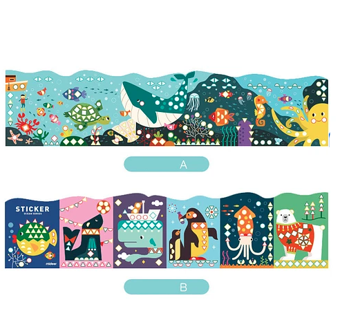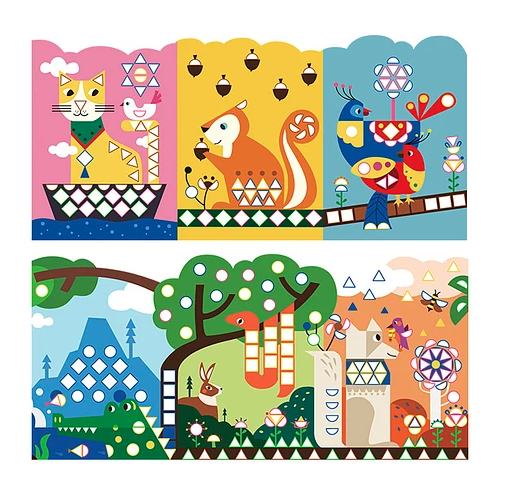 Incluye 1 poster panorámico, con 4 diferentes figuras geométricas y 5 colores diferentes de pegatinas, más de 600 pegatinas en total.