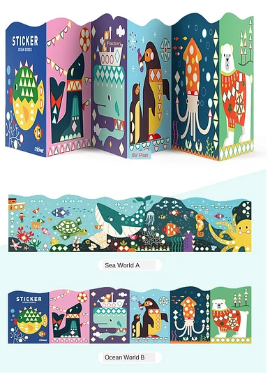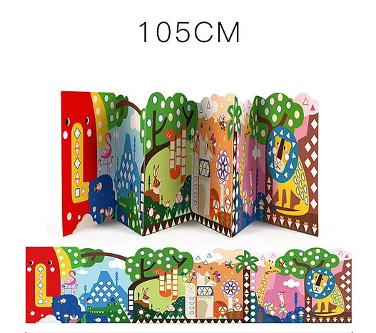 Poster panorámico de 105 cm de largo, trae 6 imágenes por cada lado, ideal para que descubran las diferentes figuras geométricas, y puedan usar los stickers correspondientes para cubrirlas, asociando forma y color. Alrededor de 400 lugares para poner las pegatinas, ayuda a fomentar la concentración de los niños. Fomenta la observación, concentración y motricidad fina.