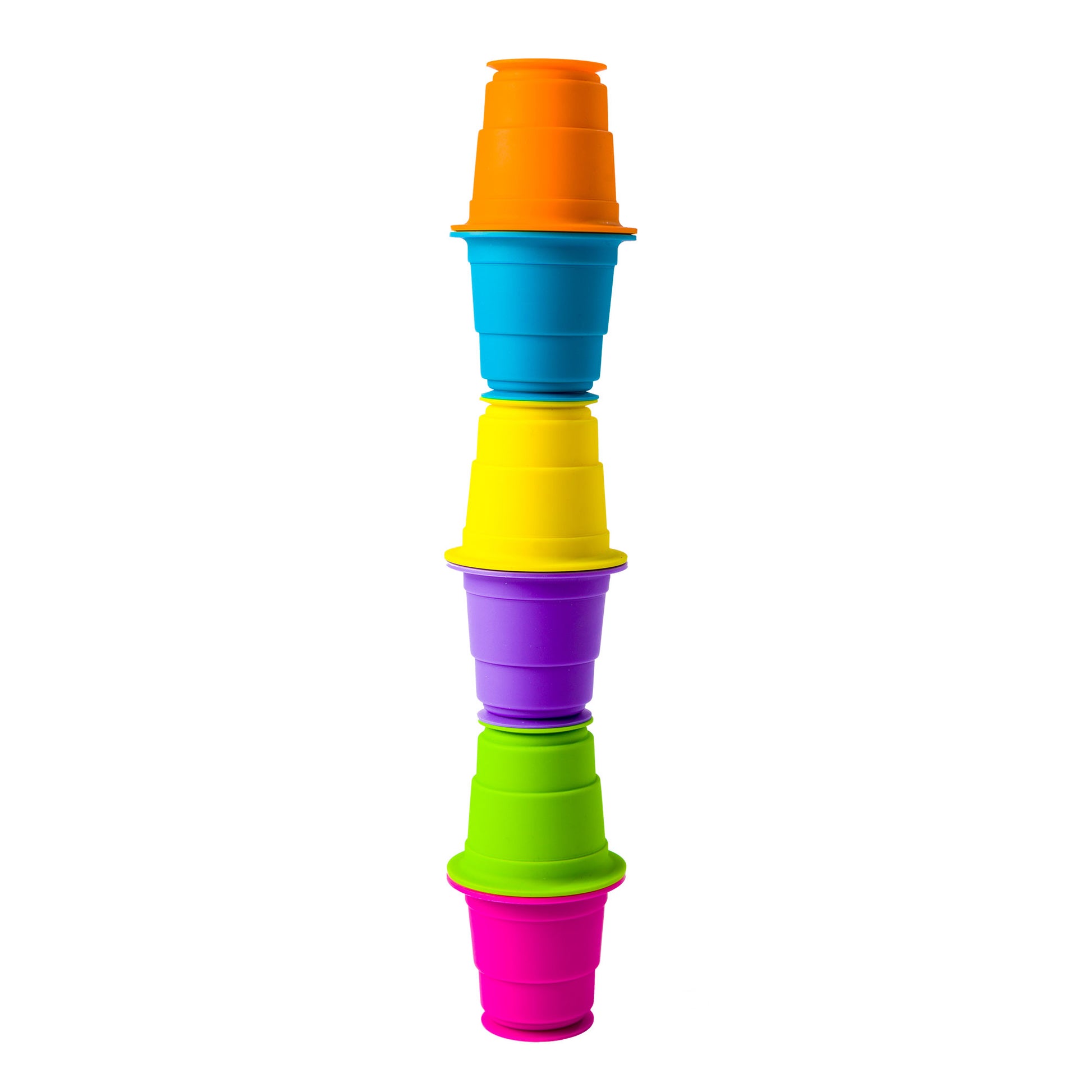 Cada una de estos vibrantes y blandos vasos de silicona tiene una base de ventosa más un borde de succión en la parte superior. Apílalos, dóblalos de costado y hazlos rodar. Pégalos en las paredes, ventanas o incluso unos a otros y luego sepáralos para escucharlos POP. O bien, solo bebe tu jugo de ellos y úsalos como vasos normales. 100% seguro para alimentos y apto para lavavajillas. Juego de 6 vasos de silicona coloridas con ventosas en la parte inferior. Hecho de 100% de silicona de grado alimentario, sin BPA, sin látex, no tóxico.