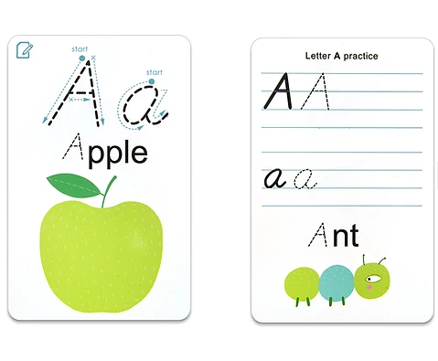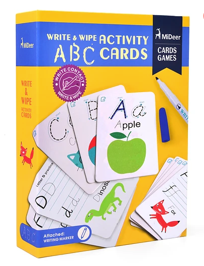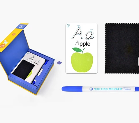 El juego de tarjetas cognitivas contiene 26 tarjetas reutilizables donde puedes escribir, un marcador lavable y un paño para limpiar. Es una manera perfecta y divertida de ayudar a los niños a aprender las letras, sumas, los números y asociación numero cantidad