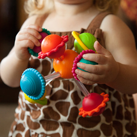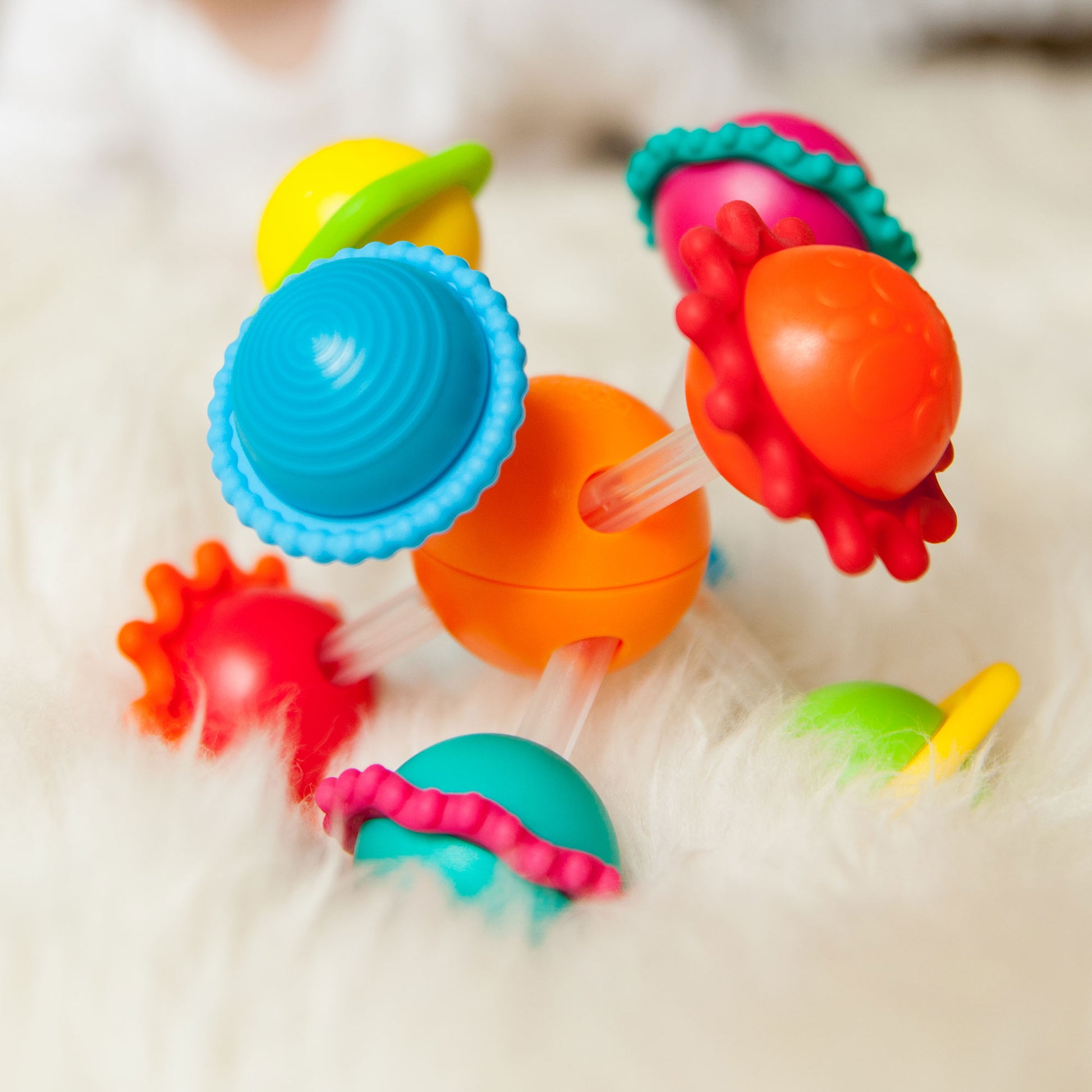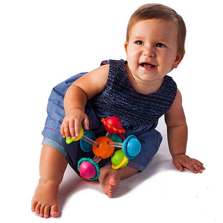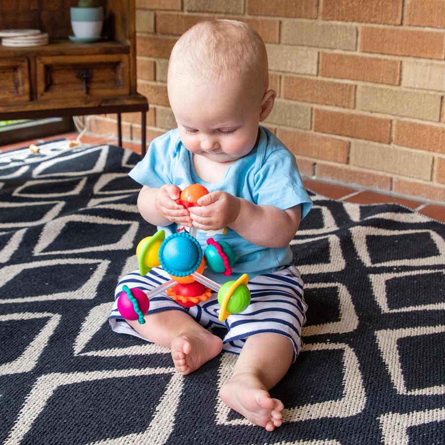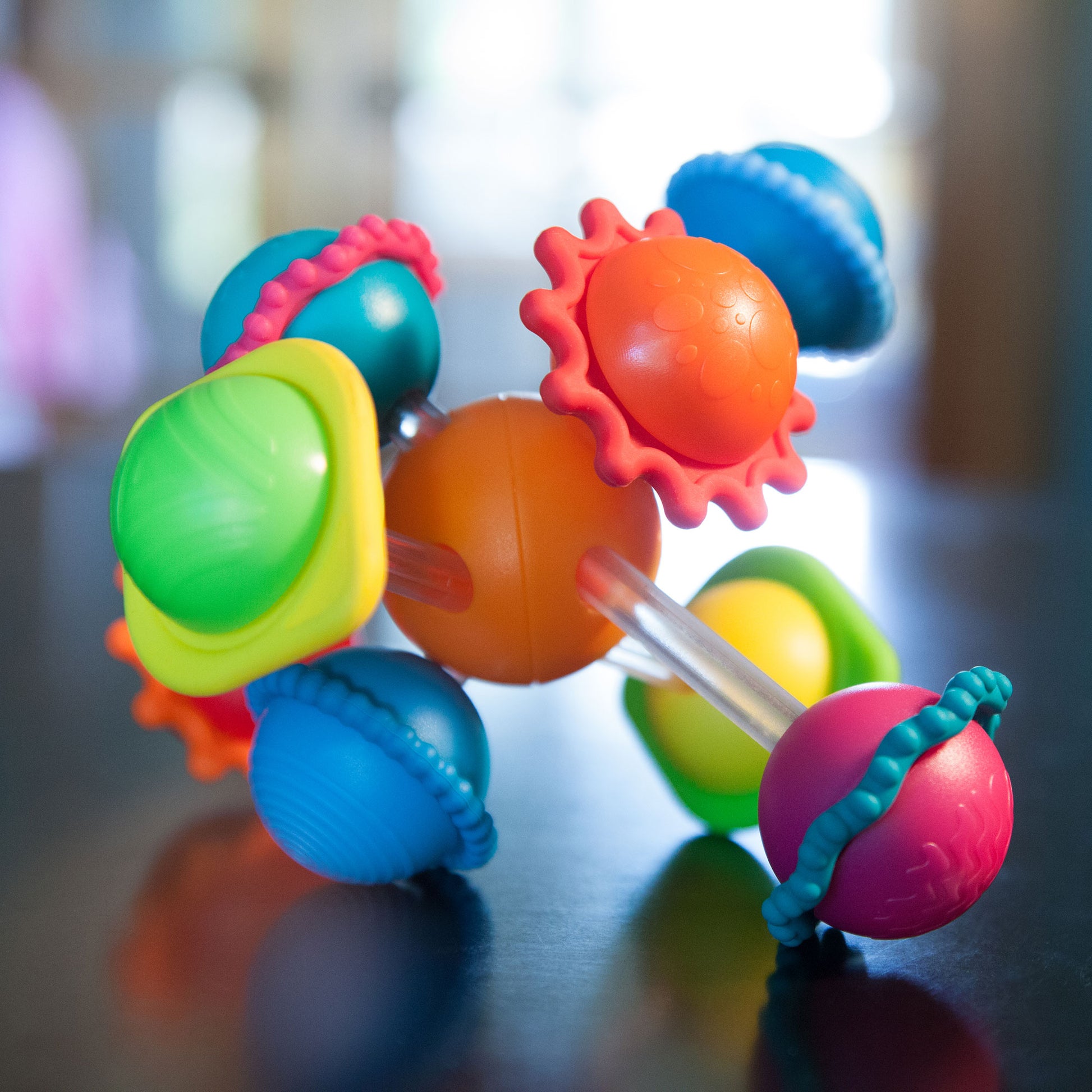Juguete sensorial lleno de colores, texturas, que les encantará explorar. 4 barras inclinadas se deslizan por una bola central, cada barra tiene una bola en su extremo con texturas únicas rodeadas de anillos de silicona. Fomenta el aprendizaje sensorial, la coordinación mano-ojo, las habilidades motoras y la exploración. ¡Los pequeños estarán descubriendo y aprendiendo en cada giro y giro! Funciona muy bien para calmar las encías. Hecho en plástico altamente resistente y silicona de grado alimentario, sin BPA, no tóxico.